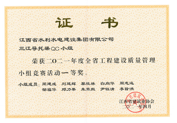 近日,2021年度江西省工程建設質量管理小組競賽活動公布名次,由公司三江導托渠QC小組開展的QC活動榮獲小組競賽活動一等獎。該獎項的獲得,為公司工程創優奠定了堅實的基礎,為公司爭得了榮譽,今后,江水建設將繼續深入開展QC活動,秉承工匠精神推動質量提升,打造更多精品工程,為樹立集團公司品牌形象繼續努力。
