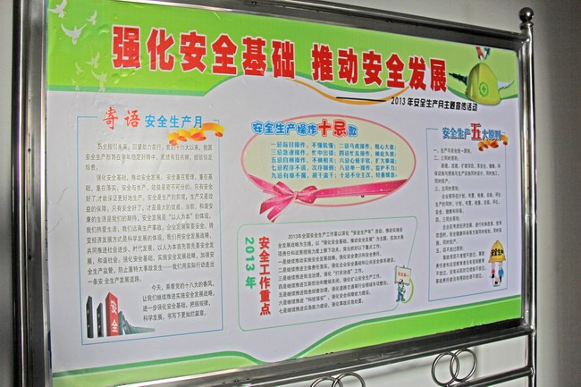 集團(tuán)資訊按照2013年“安全生產(chǎn)月”活動(dòng)實(shí)施方案要求,公司所屬各單位張貼、懸掛安全生產(chǎn)警示語(yǔ),突出宣傳“強(qiáng)化安全基礎(chǔ),推動(dòng)安全發(fā)展”的活動(dòng)主題。