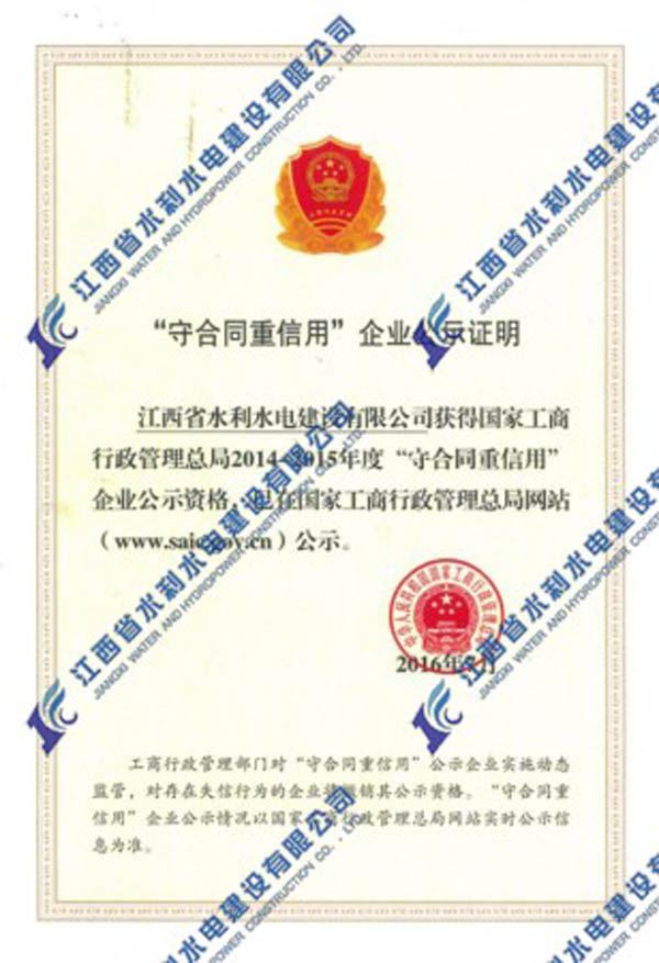 2016年我公司首次榮獲國家工商行政管理總局2014-2015年度“守合同重信用”企業(yè)公示資格。“守合同重信用”公示活動,是工商部門依托合同行政監(jiān)管職能組織開展的旨在推進企業(yè)信用建設的“守重”企業(yè)公示活動,是長期以來我國社會信用體系建設的重要組成部分。