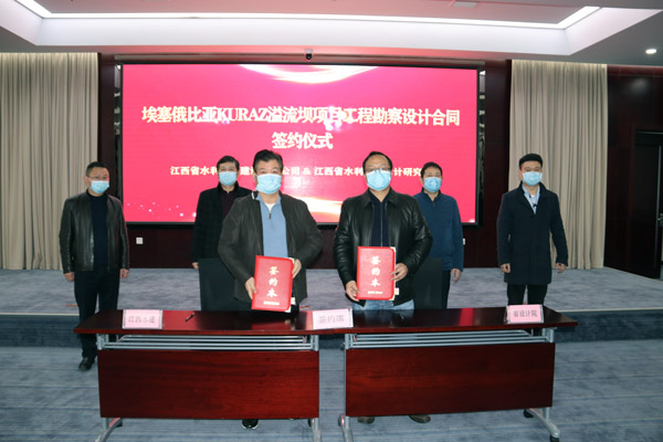 2月28日,我公司與江西省水利規劃設計研究院正式簽訂埃塞俄比亞kuraz溢流壩項目勘察設計合同。省設計院黨委書記江凌,副院長、黨委委員柯勁松,公司黨委書記、董事長王元旦,海外公司執行董事張周平等領導出席簽約儀式。